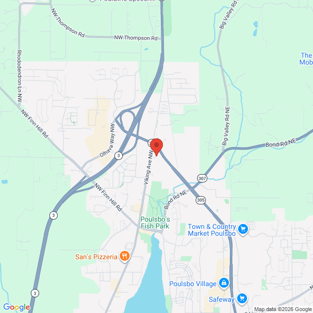 We are located at the SE corner of Viking Way and Highway 305, next to Arendal Apartments.